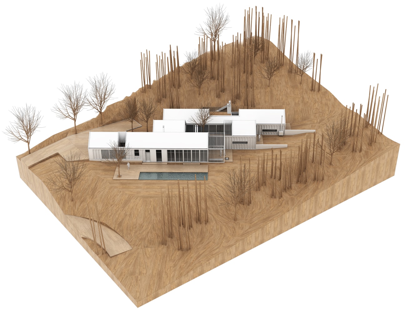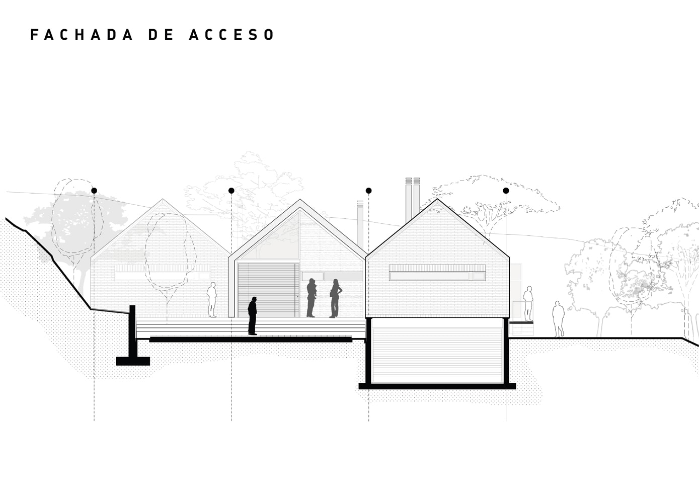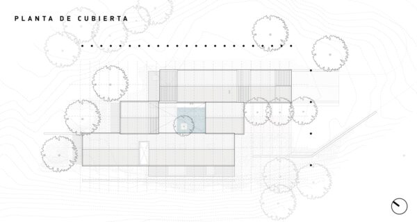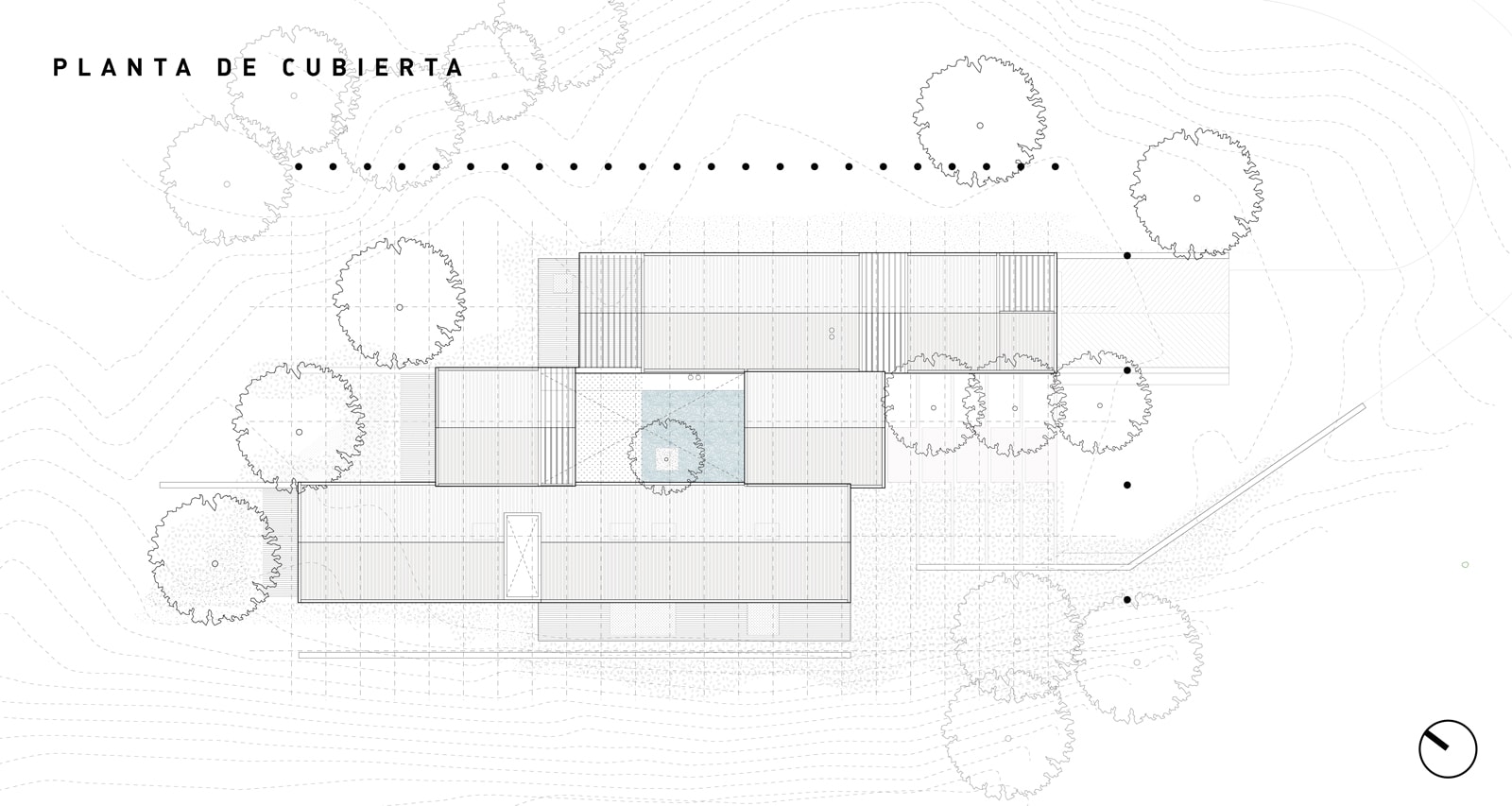 Three longitudinal volumes are proposed in the direction of the terrain’s levels, shifting and perforating to articulate the different spaces of the house and its surroundings.