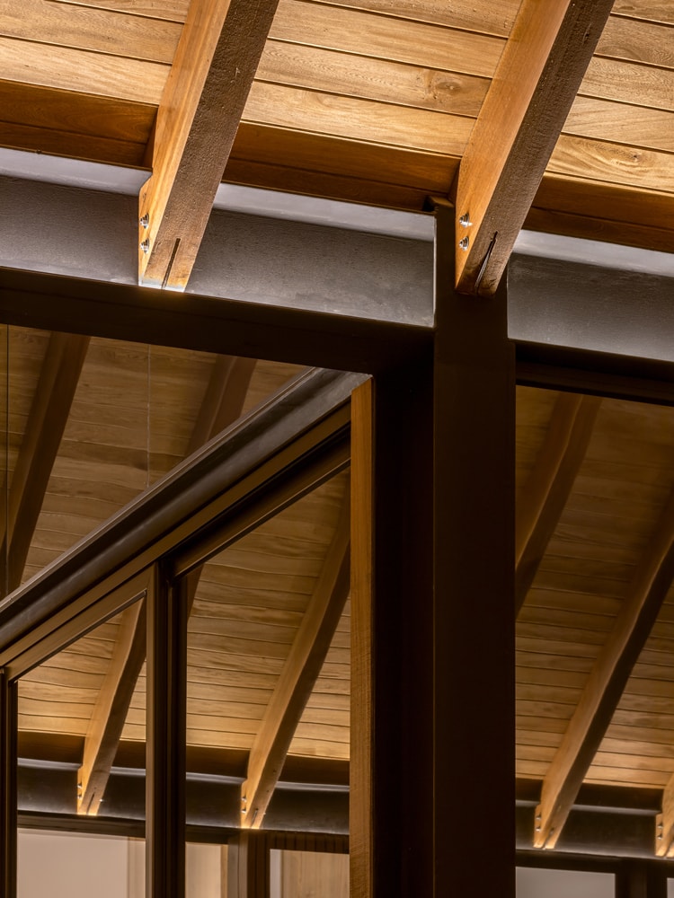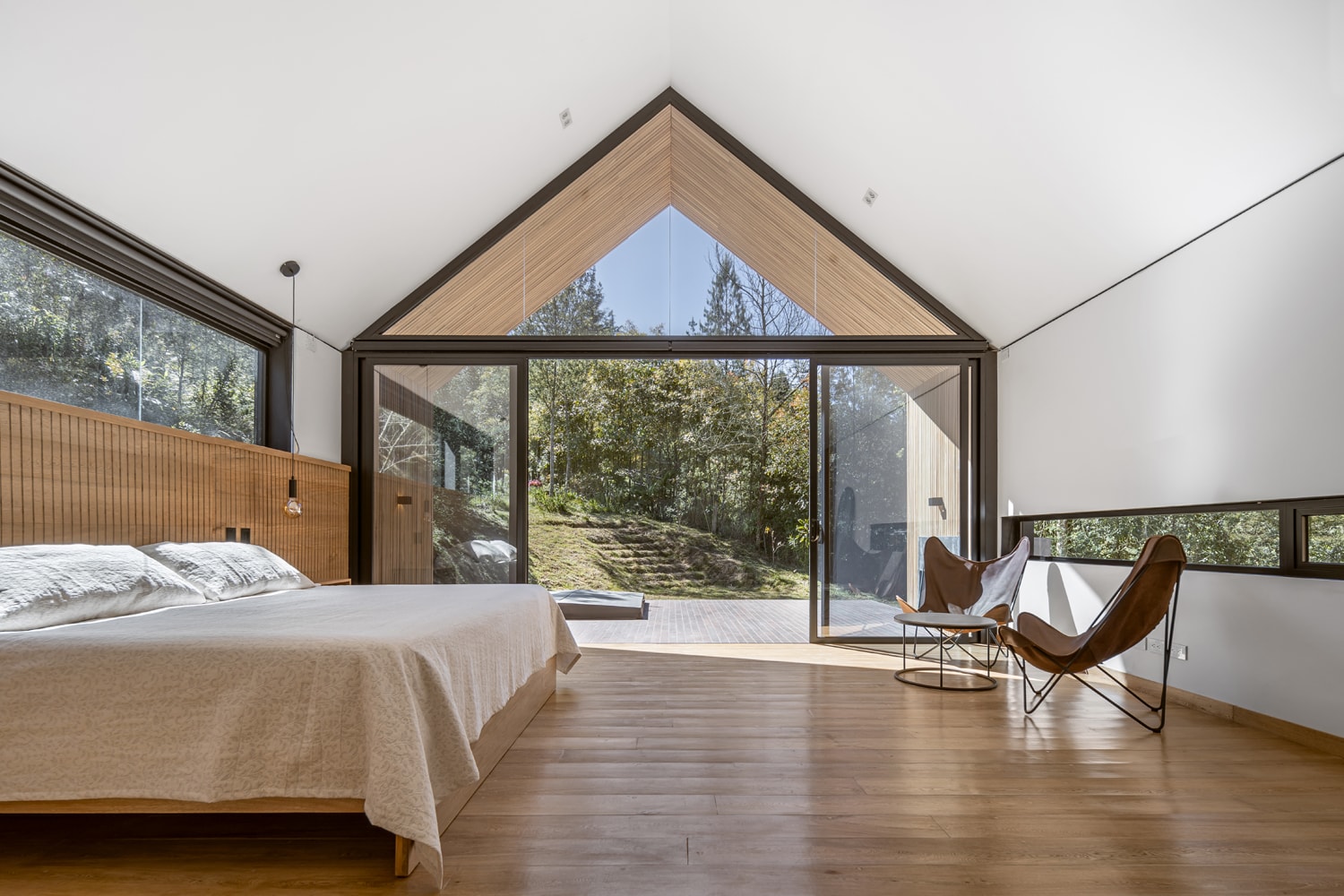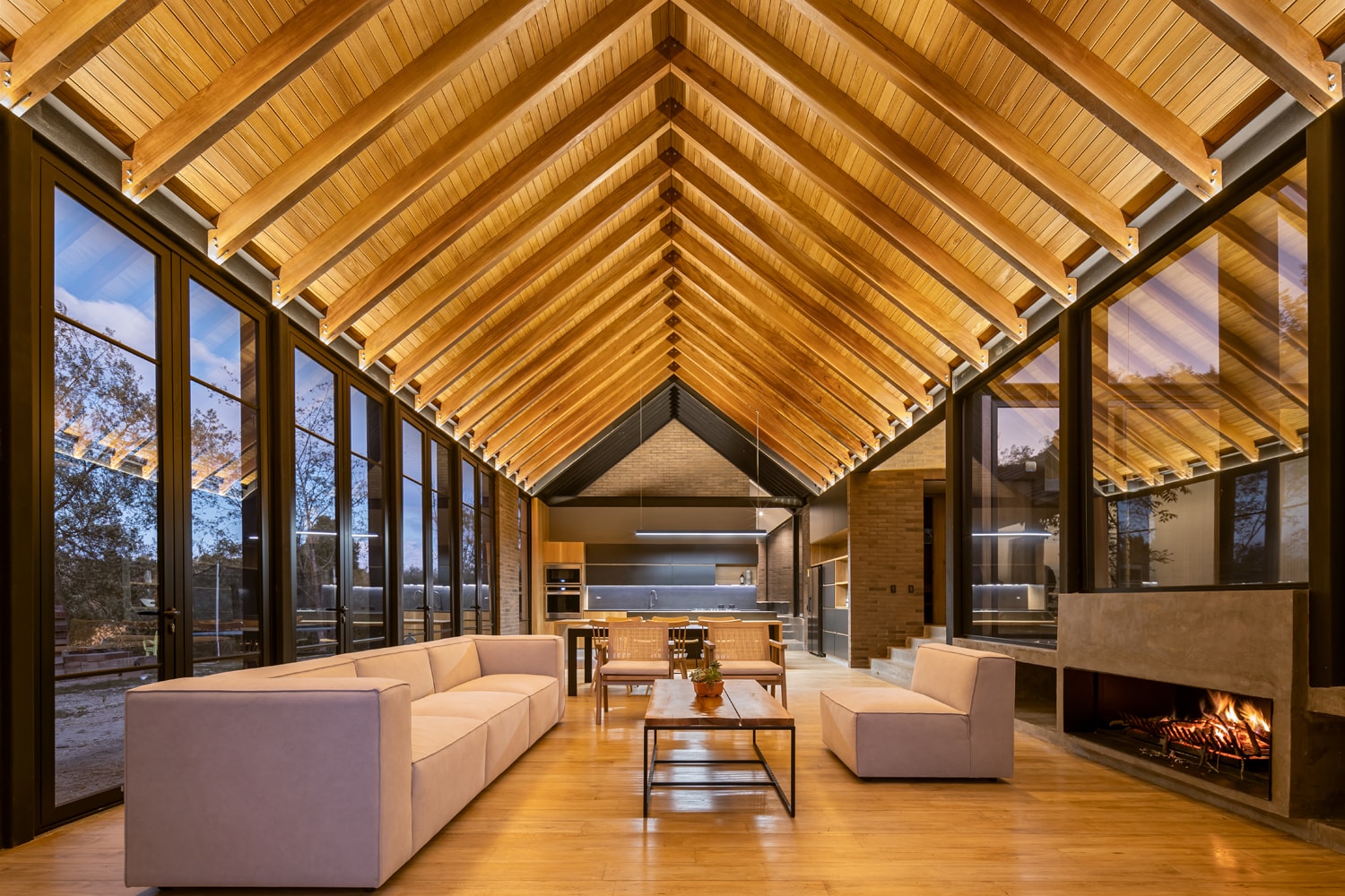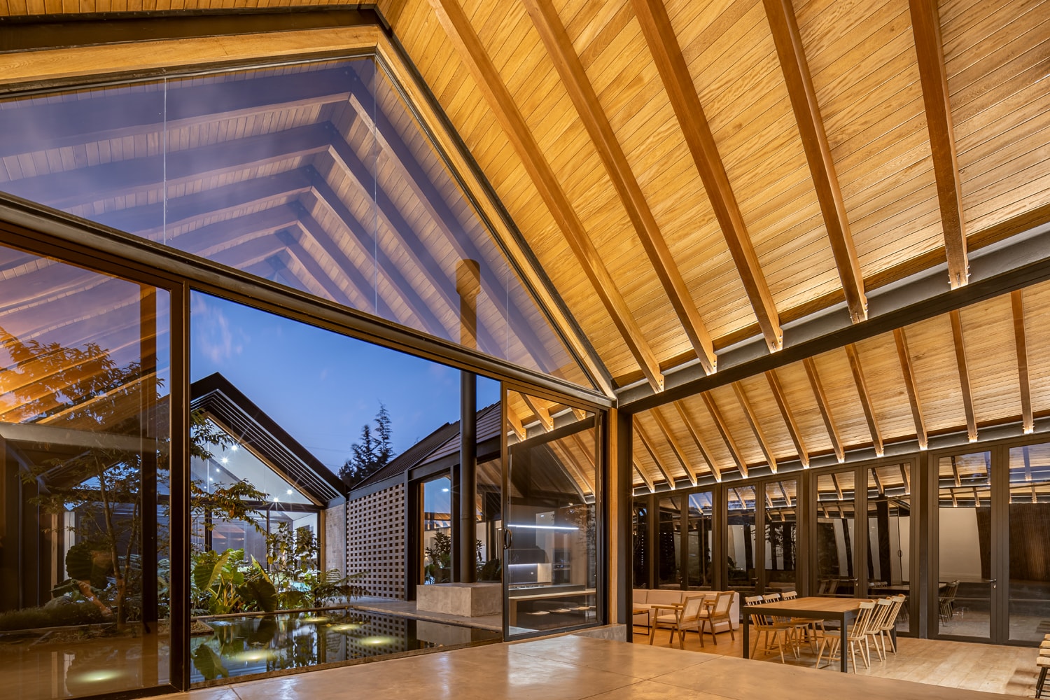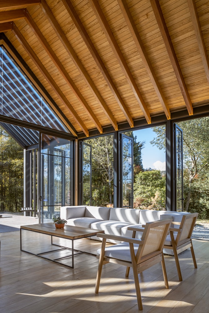 Access is through this last volume, a “”void”” composed of the foyer, the inner courtyard, and the study – spaces without walls, only delimited by glass walls that allow for the continuity of the landscape.