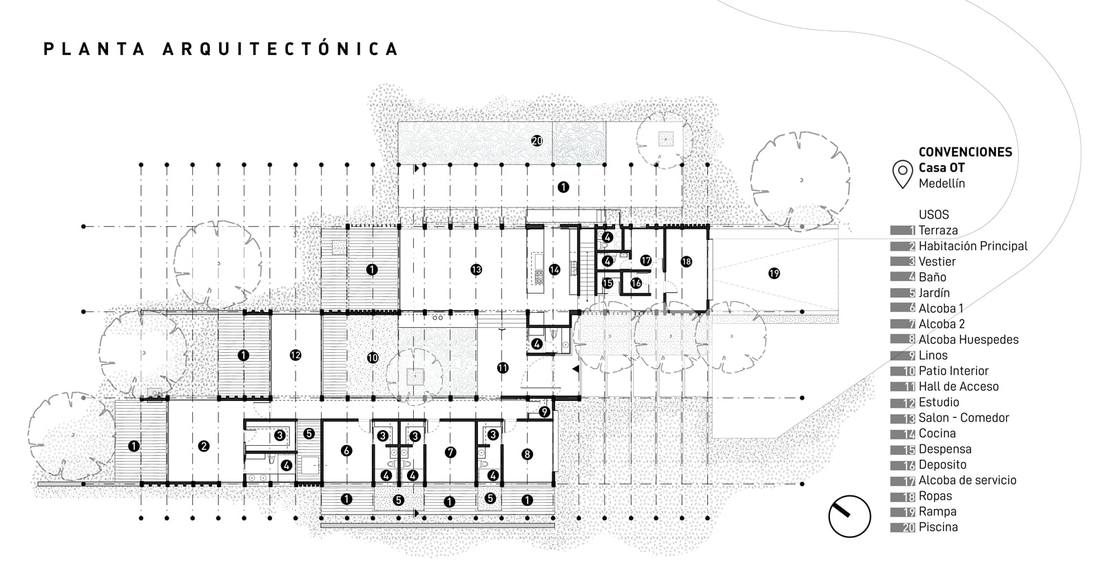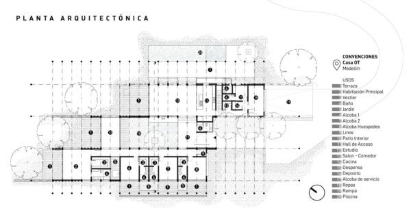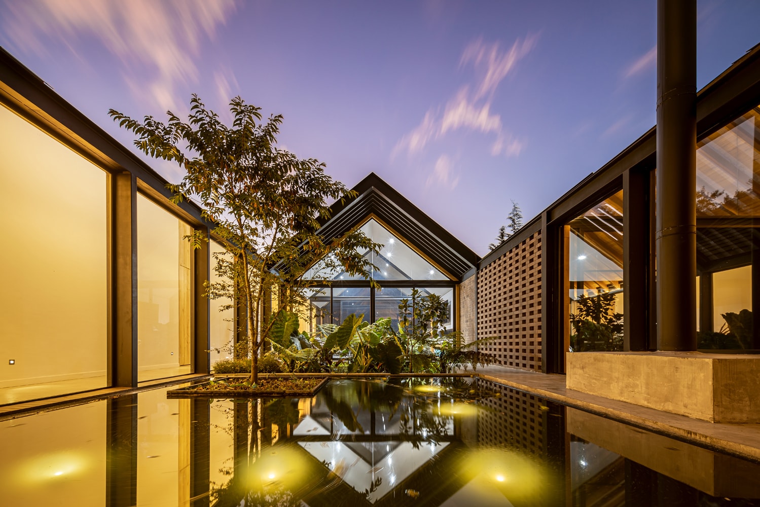 The functional scheme of the house rescues and reinterprets the structure of the traditional patio house from Antioquian colonization architecture. The patio consists of a garden of aquatic plants and native vegetation that acts as the heart of the system, allowing for visual connections (transparency) and improving the lighting and ventilation conditions of the house.
