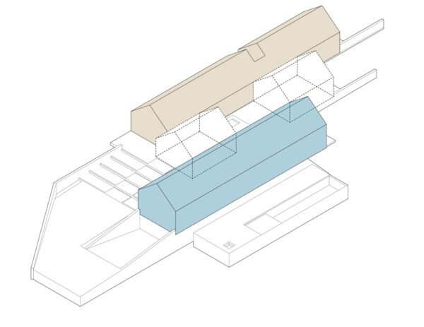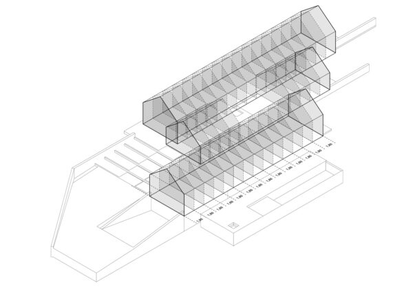 The program is divided into these three volumes: a social and service area, a bedroom area, and a central pavilion that acts as an articulator between the other two.