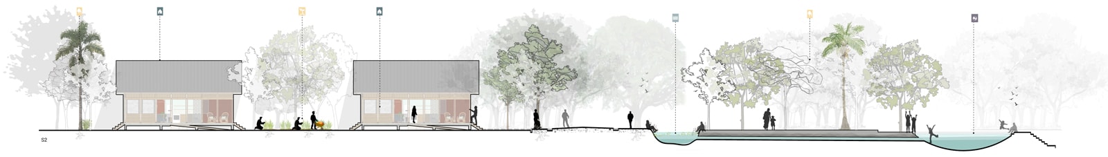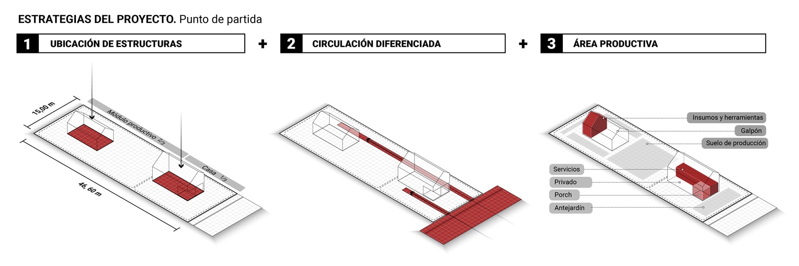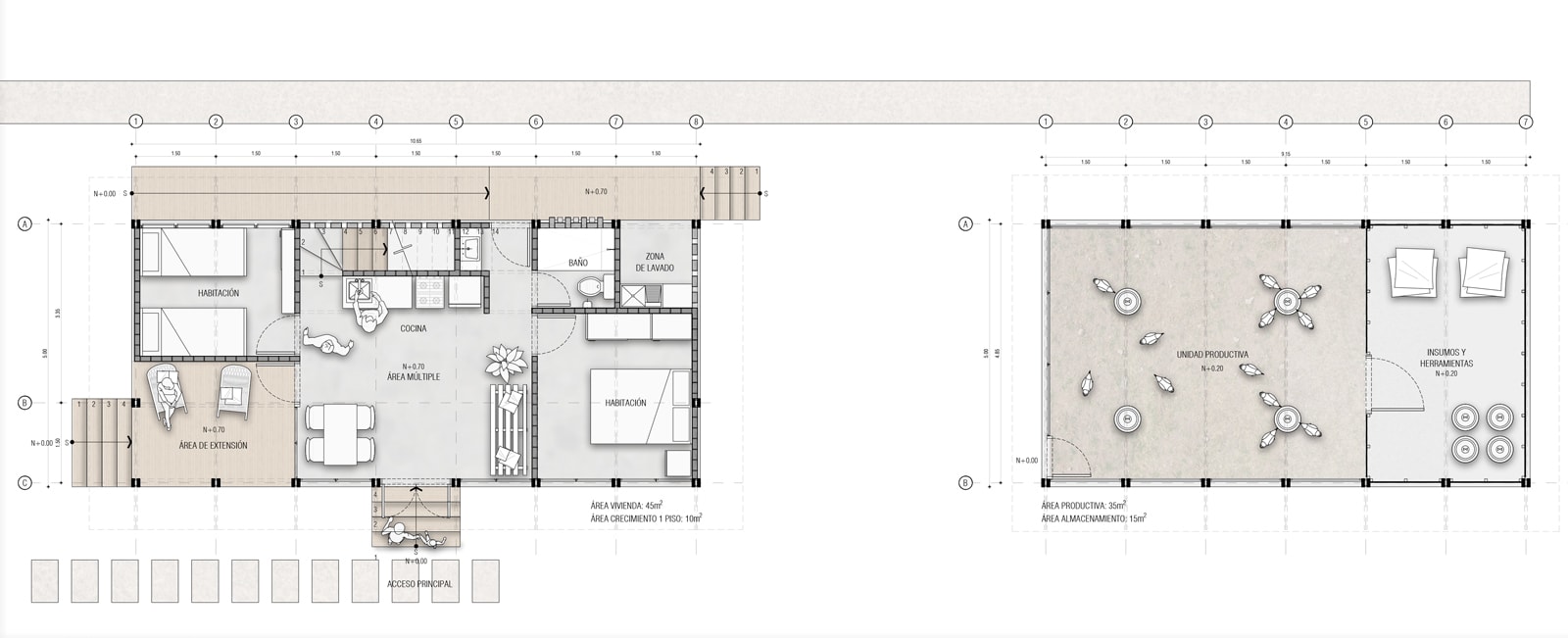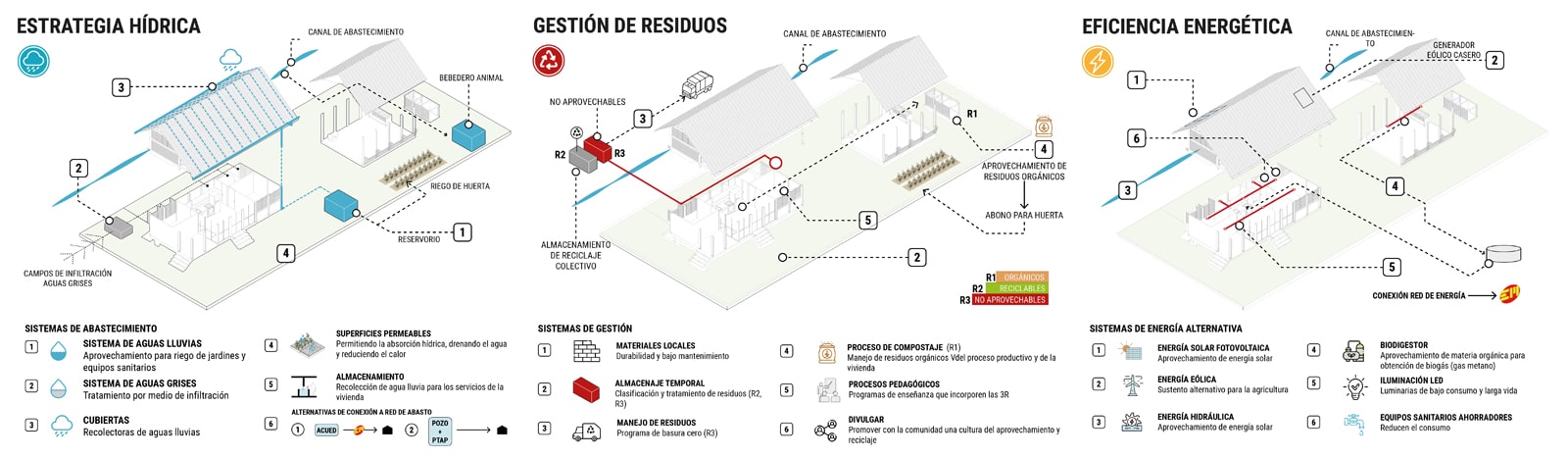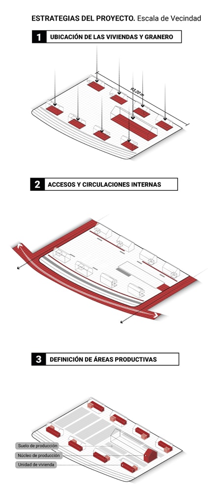 Rural housing is part of a collective, thus it must be understood on three scales: the unit, meaning the property; the grouping, referring to neighborhood blocks sharing services like water or service roads; and finally, the village, which is the aggregation of neighborhoods.