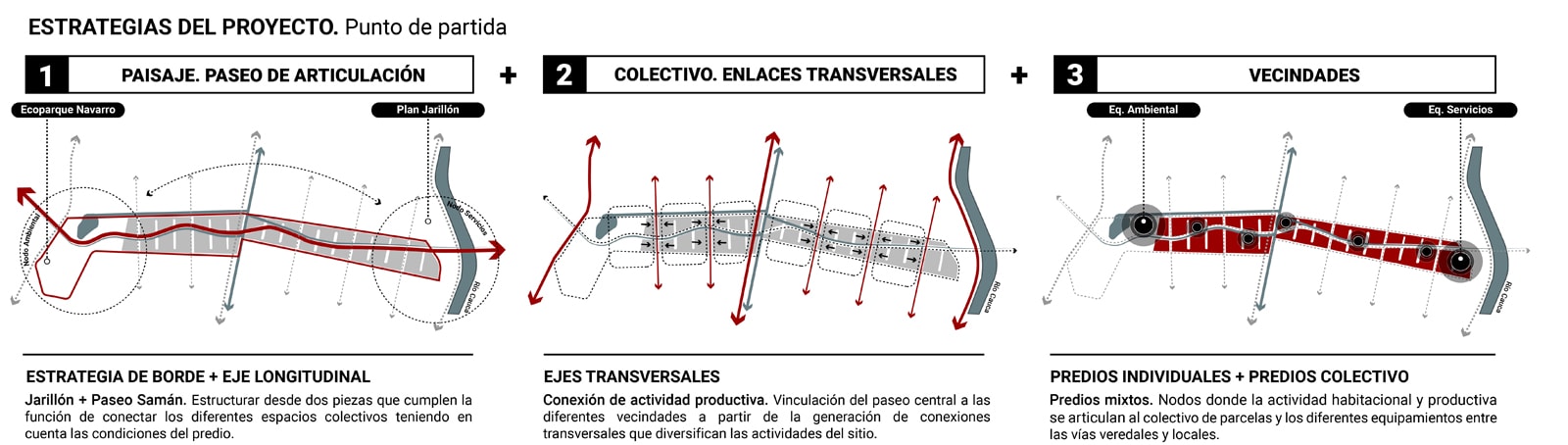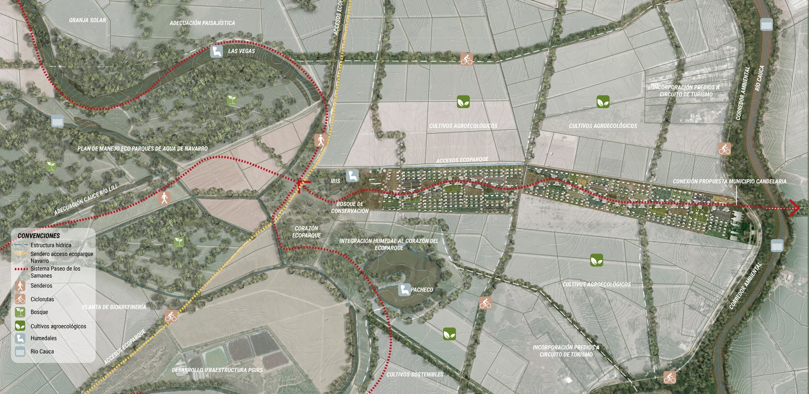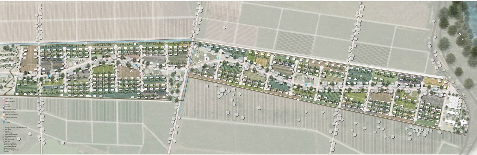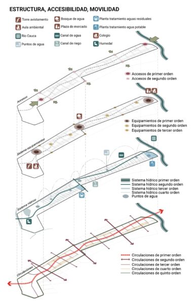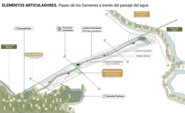 A transition strategy is proposed based on structuring the territory around water. Canals, wetlands, and rivers determine a system of trails and routes connecting urban and rural areas. This involves uses focused on education, tourism, and production under agroecological criteria.